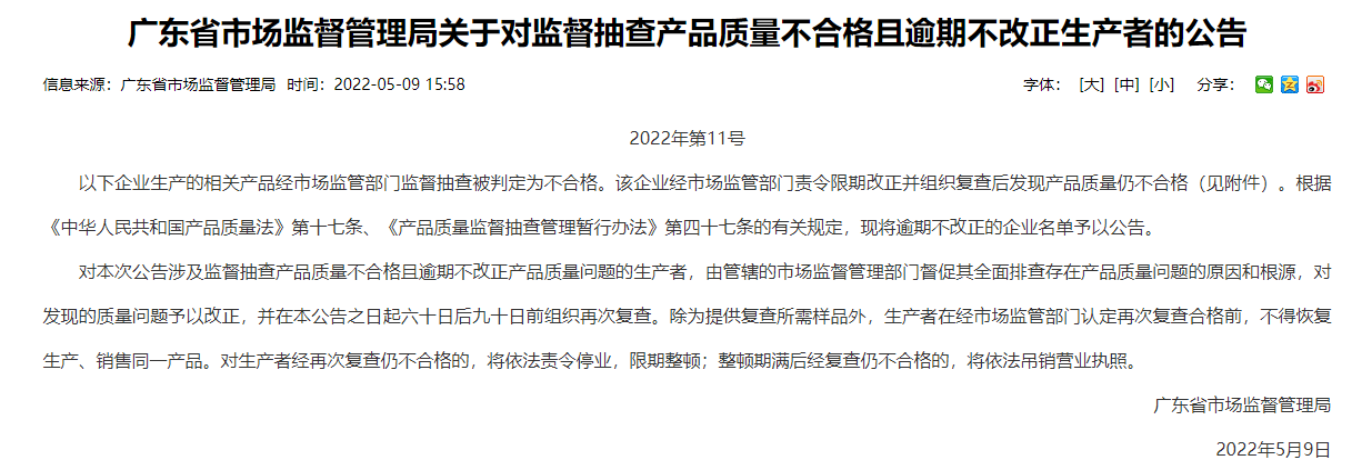 公告稱(chēng),對(duì)本次公告涉及監(jiān)督抽查產(chǎn)品質(zhì)量不合格且逾期不改正產(chǎn)品質(zhì)量問(wèn)題的生產(chǎn)者,由管轄的市場(chǎng)監(jiān)督管理部門(mén)督促其全面排查存在產(chǎn)品質(zhì)量問(wèn)題的原因和根源,對(duì)發(fā)現(xiàn)的質(zhì)量問(wèn)題予以改正,并在本公告之日起六十日后九十日前組織再次復(fù)查。除為提供復(fù)查所需樣品外,生產(chǎn)者在經(jīng)市場(chǎng)監(jiān)管部門(mén)認(rèn)定再次復(fù)查合格前,不得恢復(fù)生產(chǎn)、銷(xiāo)售同一產(chǎn)品。對(duì)生產(chǎn)者經(jīng)再次復(fù)查仍不合格的,將依法責(zé)令停業(yè),限期整頓;整頓期滿(mǎn)后經(jīng)復(fù)查仍不合格的,將依法吊銷(xiāo)營(yíng)業(yè)執(zhí)照。