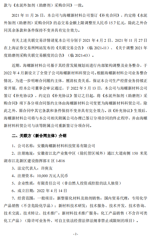 日前,海螺水泥發(fā)布《關(guān)于關(guān)聯(lián)交易合同主體變更的公告》稱,2022年5月13日,安徽海螺水泥股份有限公司與安徽海螺新材料科技有限公司簽訂《關(guān)于<水泥外加劑(助磨劑)采購(gòu)合同>的補(bǔ)充協(xié)議》,約定自《補(bǔ)充協(xié)議》簽訂之日起,將《水泥外加劑(助磨劑)采購(gòu)合同》項(xiàng)下各分項(xiàng)合同簽約主體由海螺新材料公司變更為其全資子公司安徽海螺新材料科技貿(mào)易有限公司,除此之外,原合同中其它條款和條件保持不變并具有完全效力。