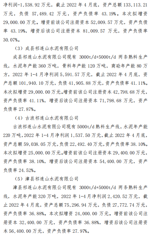 公司擬對7家子公司進(jìn)行增資,分別為青海祁連山水泥有限公司、永登祁連山水泥有限公司、成縣祁連山水泥有限公司、古浪祁連山水泥有限公司、漳縣祁連山水泥有限公司、甘谷祁連山水泥有限公司、甘肅祁連山水泥集團(tuán)有限公司(以該公司成功設(shè)立為前提)。向上述全資子公司合計(jì)增資17.3億元。公告原文如下:
