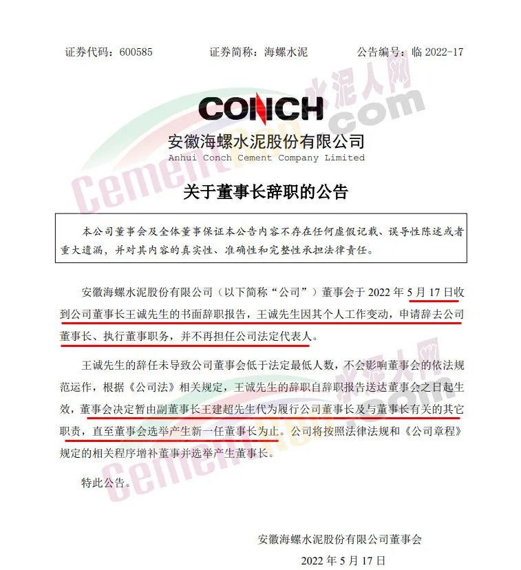 據(jù)水泥人網(wǎng)此前消息,5月16日,海螺集團召開干部大會,免去王誠同志安徽海螺集團有限責任公司黨委書記、董事長職務(wù),安徽省委對其另有任用。同時宣布由楊軍同志任安徽海螺集團有限責任公司黨委書記,并提名董事長。(相關(guān)鏈接:突發(fā)!海螺集團董事長換人!)