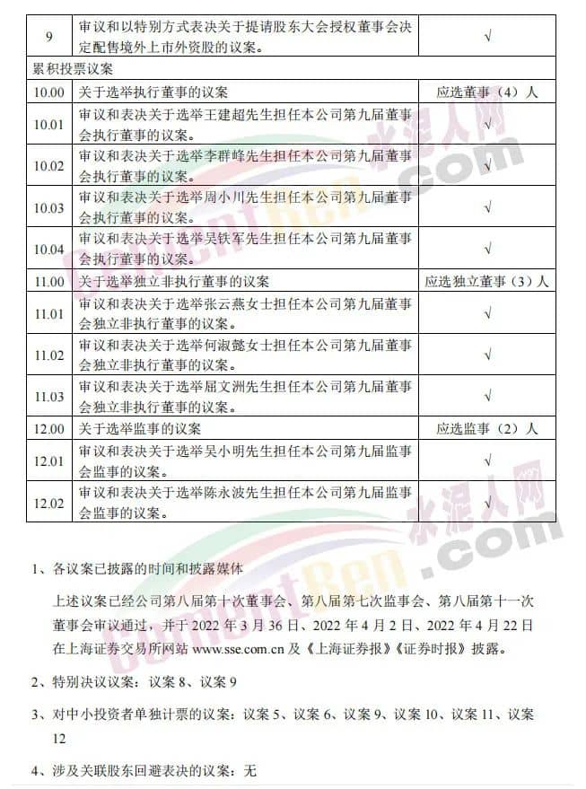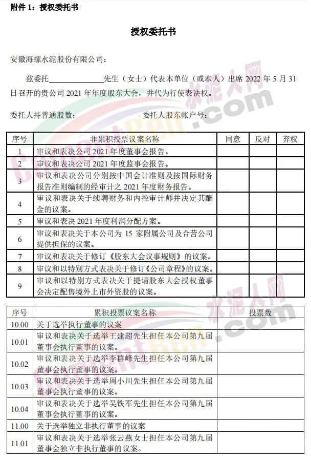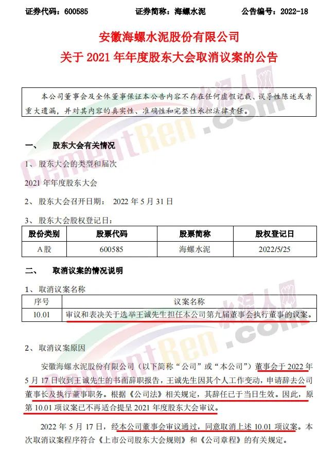 同日發(fā)布《關(guān)于2021年年度股東大會取消議案的公告》稱,安徽海螺水泥股份有限公司董事會于2022年5月17日收到王誠先生的書面辭職報告,王誠先生因其個人工作變動,申請辭去公司董事長及執(zhí)行董事職務(wù)。根據(jù)《公司法》相關(guān)規(guī)定,其辭任已于當日生效。因此,原第10.01項議案“審議和表決關(guān)于選舉王誠先生擔任本公司第九屆董事會執(zhí)行董事的議案。”已不再適合提呈2021年度股東大會審議。