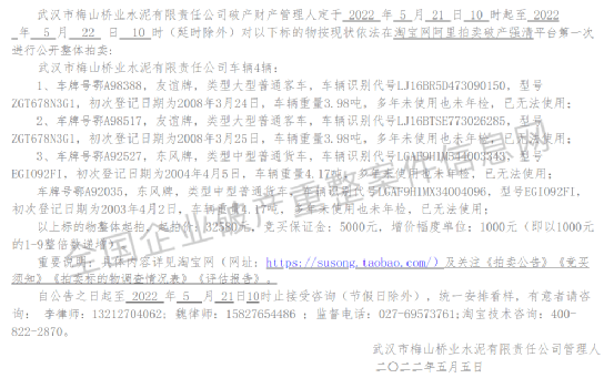 5月5日,武漢市梅山橋業(yè)水泥有限責(zé)任公司管理人發(fā)布《剩余破產(chǎn)財(cái)產(chǎn)拍賣公告》稱,武漢市梅山橋業(yè)水泥有限責(zé)任公司破產(chǎn)財(cái)產(chǎn)管理人定于2022年5月21日10時(shí)起至2022年5月22日10時(shí)對(duì)標(biāo)的物按現(xiàn)狀依法在淘寶網(wǎng)阿里拍賣破產(chǎn)強(qiáng)清平臺(tái)第一次進(jìn)行公開整體拍賣。