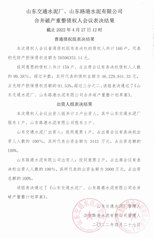 4月27日山東交通水泥廠、山東路港水泥有限公司管理人發(fā)布普通債權(quán)組表決通過了《山東交通水泥廠、山東路港水泥有限公司合并破產(chǎn)重整計(jì)劃草案》。