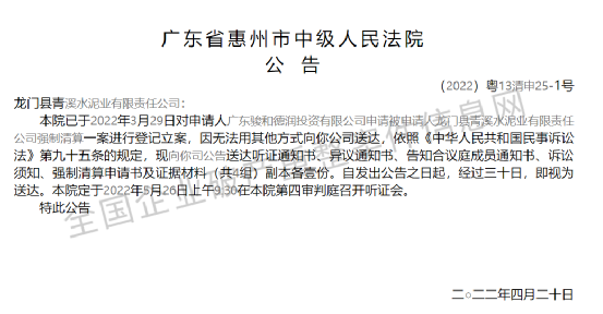 4月20日廣東省惠州市中級(jí)人民法院發(fā)布公告稱,法院已于2022年3月29日對(duì)申請(qǐng)人廣東駿和德潤(rùn)投資有限公司申請(qǐng)被申請(qǐng)人龍門縣青溪水泥業(yè)有限責(zé)任公司強(qiáng)制清算一案進(jìn)行登記立案,因無法用其他方式向龍門縣青溪水泥業(yè)有限責(zé)任公司送達(dá),依照《中華人民共和國(guó)民事訴訟法》第九十五條的規(guī)定,現(xiàn)向其公告送達(dá)聽證通知書、異議通知書、告知合議庭成員通知書、訴訟須知、強(qiáng)制清算申請(qǐng)書及證據(jù)材料(共4組)副本等。