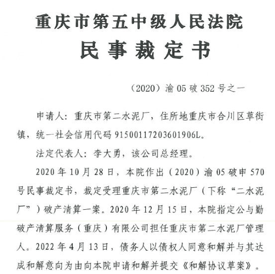 4月19日重慶市第五中級(jí)人民法院民事裁定書顯示,重慶市第二水泥廠在法院受理破產(chǎn)申請(qǐng)后,宣告破產(chǎn)。債務(wù)人提出的和解協(xié)議草案載明了清償債務(wù)的資金來源、清償比例、期限等,符合法律規(guī)定。予以準(zhǔn)許。