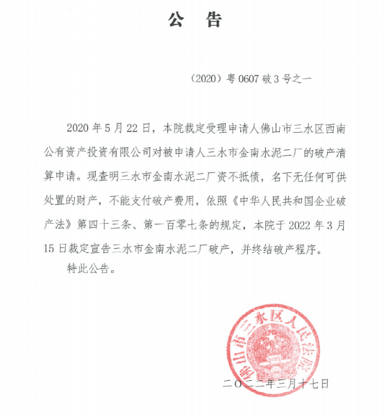 3月27日佛山市三水區(qū)人民法院公告,三水市金南水泥二廠資不抵債,名下無任何可供處理的財(cái)產(chǎn),不能支付破產(chǎn)費(fèi)用,依照相關(guān)規(guī)定315日裁定宣告三水金南水泥二廠破產(chǎn)。