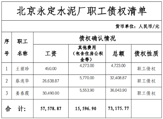 3月14日,北京永定水泥廠管理人發(fā)布了《北京永定水泥廠破產(chǎn)清算案職工債權(quán)的第二次公示》,公示附表顯示,北京永定水泥廠三名職工債權(quán)總額為73175.77元。