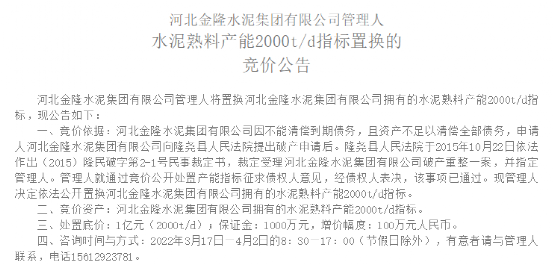 2月26日,河北金隆水泥集團(tuán)有限公司管理人發(fā)布《水泥熟料產(chǎn)能2000t/d指標(biāo)置換的競(jìng)價(jià)公告》提到,河北金降隆水泥集團(tuán)有限公司因不能清償?shù)狡趥鶆?wù),且資產(chǎn)不足以清償全部債務(wù),申請(qǐng)人河北金隆水泥集團(tuán)有限公司向隆堯縣人民法院提出破產(chǎn)申請(qǐng)后。隆堯縣人民法院于2015年10月22日依法作出(2015)隆民破字第2-1號(hào)民事裁定書,裁定受理河北金隆水泥集團(tuán)有限公司破產(chǎn)重整一案,并指定管理人。管理人就通過競(jìng)價(jià)公開處置產(chǎn)能指標(biāo)征求債權(quán)人意見,經(jīng)債權(quán)人表決,該事項(xiàng)已通過。現(xiàn)管理人決定依法公開置換河北金隆水泥集團(tuán)有限公司擁有的水泥熟料產(chǎn)能2000t/d指標(biāo)。