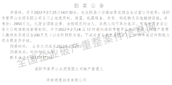 2月17,洛陽(yáng)市紫羅山水泥有限公司破產(chǎn)管理人河南德惠拍賣有限公司發(fā)布拍賣公告,公開拍賣紫羅山水泥有限公司名下土地使用權(quán)、房屋、機(jī)器設(shè)備、存貨、構(gòu)筑物及其他輔助設(shè)施。參考價(jià)∶2450萬元,凡符合國(guó)家法律、法規(guī)規(guī)定的法人、自然人均可參加競(jìng)買。