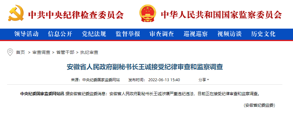 據(jù)安徽省紀(jì)委監(jiān)委消息:安徽省人民政府副秘書長王誠涉嫌嚴(yán)重違紀(jì)違法,目前正在接受紀(jì)律審查和監(jiān)察調(diào)查。