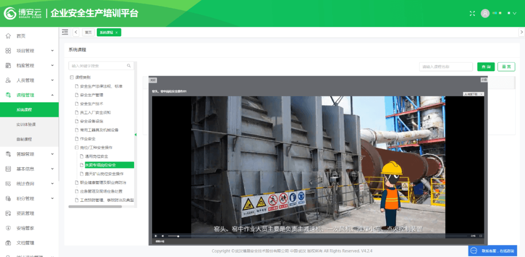 3、課程內容匯集各行業(yè)專家的精品課程,擁有課程云、題庫云、專家云等豐富培訓資源,應用場景包括:入場教育、三級安全教育、管理知識安全培訓、各工種作業(yè)安全教育、專項作業(yè)安全教育以及事故案例警示教育等,能滿足水泥企業(yè)各崗位安全生產培訓的需要;
