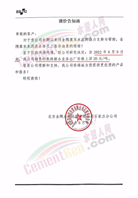日前,北京金隅水泥經(jīng)貿(mào)有限公司石家莊分公司通知,鑒于目前市場環(huán)境,公司銷售的熟料新辦業(yè)務(wù)出廠價格上浮20元/噸。