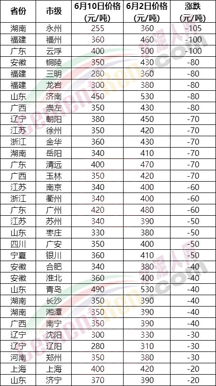 據(jù)水泥人網(wǎng)信息中心數(shù)據(jù),6月中上旬,三十多個(gè)地區(qū)水泥價(jià)格持續(xù)下滑,其中湖南永州水泥價(jià)格直降105元/噸,其次是福建福州和廣東云浮周降價(jià)100元/噸。