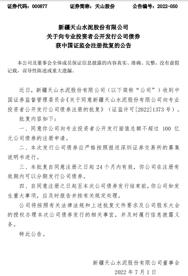 近日,新疆天山水泥股份有限公司(以下簡稱“公司”)收到中國證券監(jiān)督管理委員會《關于同意新疆天山水泥股份有限公司向專業(yè)投資者公開發(fā)行公司債券注冊的批復》(證監(jiān)許可[2022]1373號)。批復內容為同意天山水泥向專業(yè)投資者公開發(fā)行面值總額不超過100億元公司債券的注冊申請。