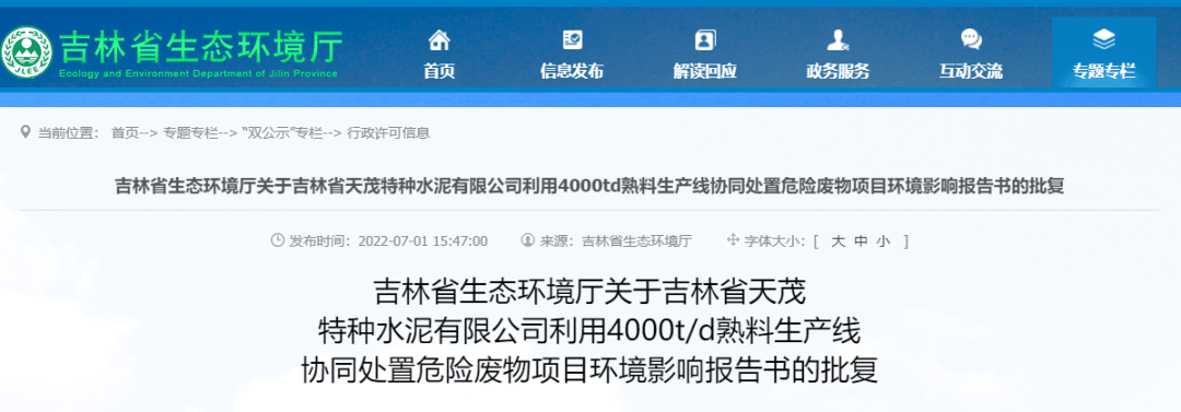 你公司《關(guān)于〈吉林省天茂特種水泥有限公司利用4000t/d熟料生產(chǎn)線協(xié)同處置危險(xiǎn)廢物項(xiàng)目環(huán)境影響報(bào)告書〉審查的申請》及委托吉林省中實(shí)環(huán)保工程開發(fā)有限公司編制的環(huán)境影響報(bào)告書(報(bào)批版)收悉。經(jīng)研究,現(xiàn)批復(fù)如下: