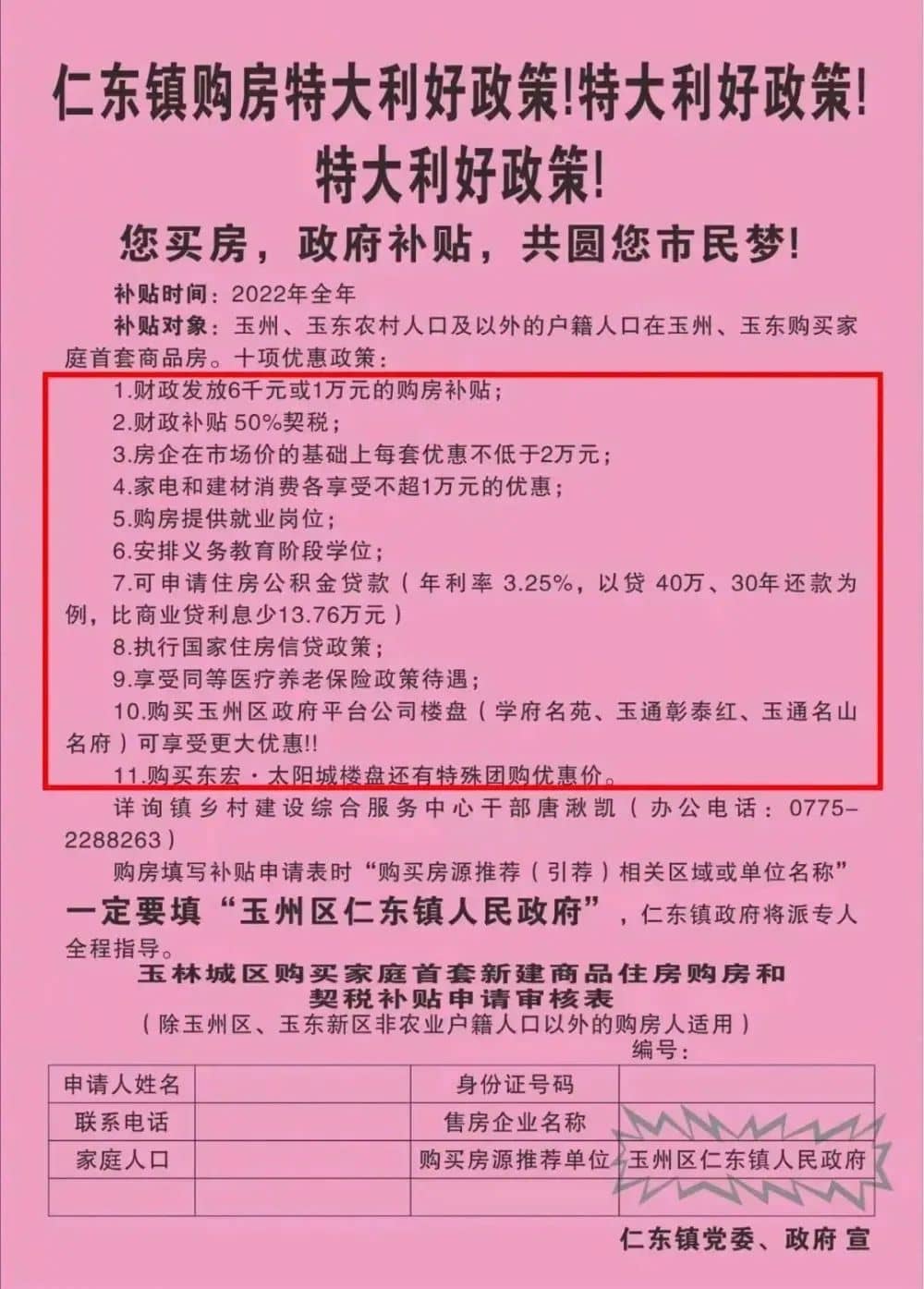 玉林市玉州區(qū)仁東鎮(zhèn)黨委、政府發(fā)購(gòu)房特大利好政策。購(gòu)房填寫補(bǔ)貼申請(qǐng)表時(shí)“購(gòu)買房源推薦(引薦)相關(guān)區(qū)域或單位名稱”一定要填“玉州區(qū)仁東鎮(zhèn)人民政府”,仁東鎮(zhèn)政府將派專人全程指導(dǎo)。