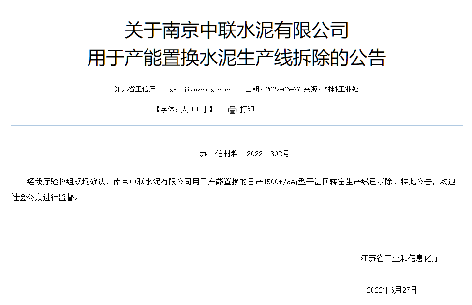 同期,江蘇省工業(yè)和信息化廳發(fā)布公告顯示,南京中聯(lián)水泥有限公司用于產(chǎn)能置換的1500t/d新型干法回轉(zhuǎn)窯生產(chǎn)線(xiàn)已拆除。