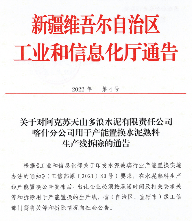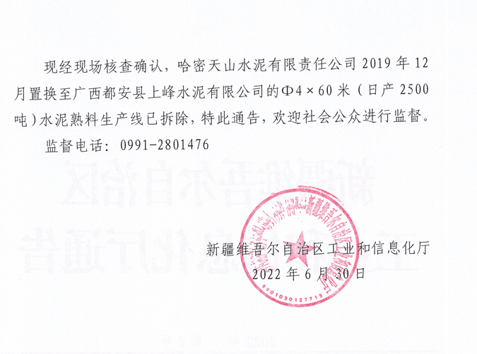 6月30日,新疆維吾爾自治區(qū)工業(yè)和信息化廳發(fā)布3則水泥生產(chǎn)線(xiàn)拆除的通告提到,哈密天山水泥2500t/d、吐魯番天山2000t/d、阿克蘇天山多浪水泥2000t/d熟料生產(chǎn)線(xiàn)已拆除。三條生產(chǎn)線(xiàn)產(chǎn)指指標(biāo)均置換至廣西都安縣上峰水泥有限公司的水泥熟料生產(chǎn)線(xiàn)項(xiàng)目。