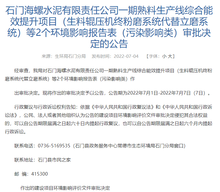 7月4日,湖南省常德市石門(mén)縣政府轉(zhuǎn)發(fā)環(huán)局石門(mén)分局的《石門(mén)海螺水泥有限責(zé)任公司一期熟料生產(chǎn)線(xiàn)綜合能效提升項(xiàng)目(生料輥壓機(jī)終粉磨系統(tǒng)代替立磨系統(tǒng))等2個(gè)環(huán)境影響報(bào)告表(污染影響類(lèi))審批決定的公告》稱(chēng),經(jīng)審查,生環(huán)局石門(mén)分局對(duì)石門(mén)海螺水泥有限責(zé)任公司一期熟料生產(chǎn)線(xiàn)綜合能效提升項(xiàng)目(生料輥壓機(jī)終粉磨系統(tǒng)代替立磨系統(tǒng))等2個(gè)環(huán)境影響報(bào)告表(污染影響類(lèi))作出審批決定。并將作出的審批決定予以公告。公告期為2022年7月1日-2022年7月7日。