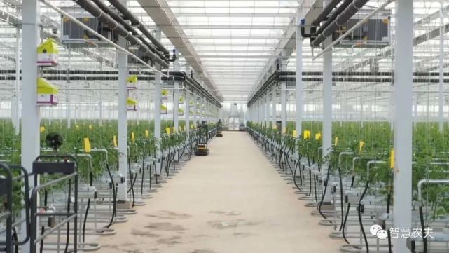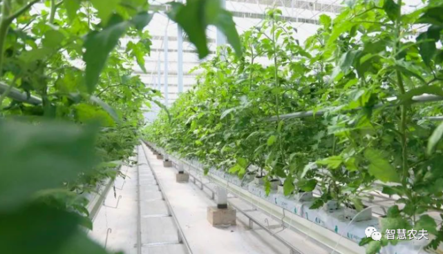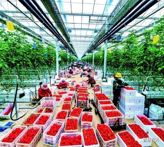 在溫室內(nèi)碧綠的番茄長得郁郁蔥蔥,長長的懸掛式鋼絲蔓繩,有利于作物攀爬生長,增加產(chǎn)量。成排的管道通往室內(nèi)各個方向,筆直的采摘軌道,既用來運載采摘車,也用來傳遞余熱轉化成的熱水或者冷水。番茄生長每一個環(huán)節(jié)都依托大數(shù)據(jù)云計算自動采集、監(jiān)測、分析農(nóng)作物生長環(huán)境信息,并利用物聯(lián)網(wǎng)技術,精準調(diào)控棚內(nèi)的溫度、濕度、施肥量、澆水量等,科學調(diào)節(jié)農(nóng)作物生命規(guī)律,延長生長周期,實現(xiàn)智慧化管理、標準化生產(chǎn)。