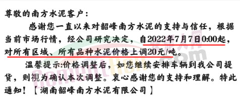 湖南金山水泥通知,由于公司原材料價格大幅上漲,結(jié)合公司當前銷售形勢,經(jīng)公司研究決定,自7月5日0時起對包裝各規(guī)格水泥產(chǎn)品價格上調(diào)20元/噸。
