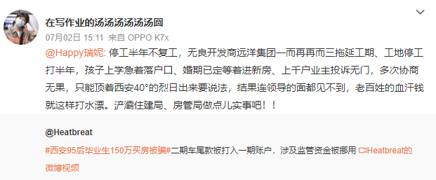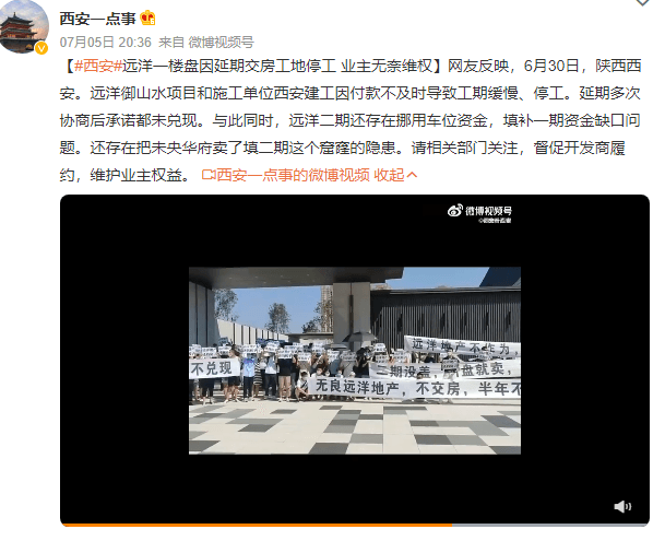 6月30日,陜西西安。遠(yuǎn)洋御山水項(xiàng)目和施工單位西安建工因付款不及時(shí)導(dǎo)致工期緩慢、停工。延期多次協(xié)商后承諾都未兌現(xiàn)。與此同時(shí),遠(yuǎn)洋二期還存在挪用車位資金,填補(bǔ)一期資金缺口問(wèn)題。還存在把未央華府賣了填二期這個(gè)窟窿的隱患。