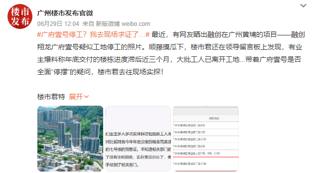 融創(chuàng)在廣州黃埔的項(xiàng)目——融創(chuàng)翔龍廣府壹號(hào)疑似工地停工。在領(lǐng)導(dǎo)留言板上發(fā)現(xiàn),有業(yè)主爆料稱年底交付的樓棟進(jìn)度滯后近三個(gè)月,大批工人已離開(kāi)工地。