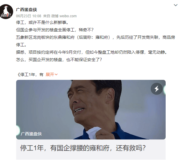 五象新區(qū)龍崗板塊的東鼎雍和府,先后歷經(jīng)了開(kāi)發(fā)商失聯(lián),商品房停工。項(xiàng)目按約定將在今年9月交付,但如今整盤工地卻仍然陷入停擺,毫無(wú)動(dòng)靜。