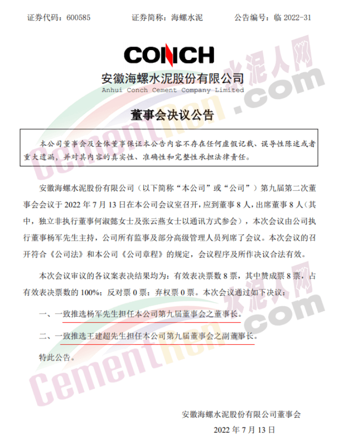 海螺水泥(600585)7月13日晚間公告,公司第九屆第二次董事會(huì)會(huì)議于當(dāng)日召開,會(huì)議一致推選楊軍擔(dān)任公司第九屆董事會(huì)之董事長(zhǎng);一致推選王建超擔(dān)任公司第九屆董事會(huì)之副董事長(zhǎng)。