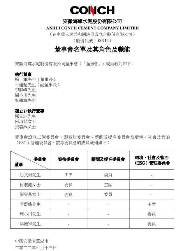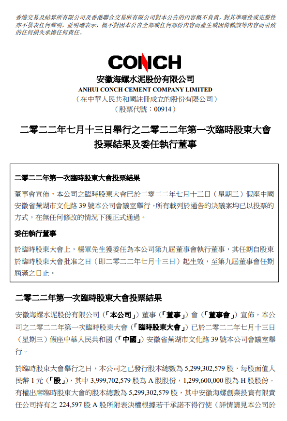 楊先生于二零二二年五月加入安徽海螺集團(tuán)有限責(zé)任公司(「海螺集團(tuán)」),現(xiàn)擔(dān)任海螺集團(tuán)黨委書記、董事長(zhǎng)。