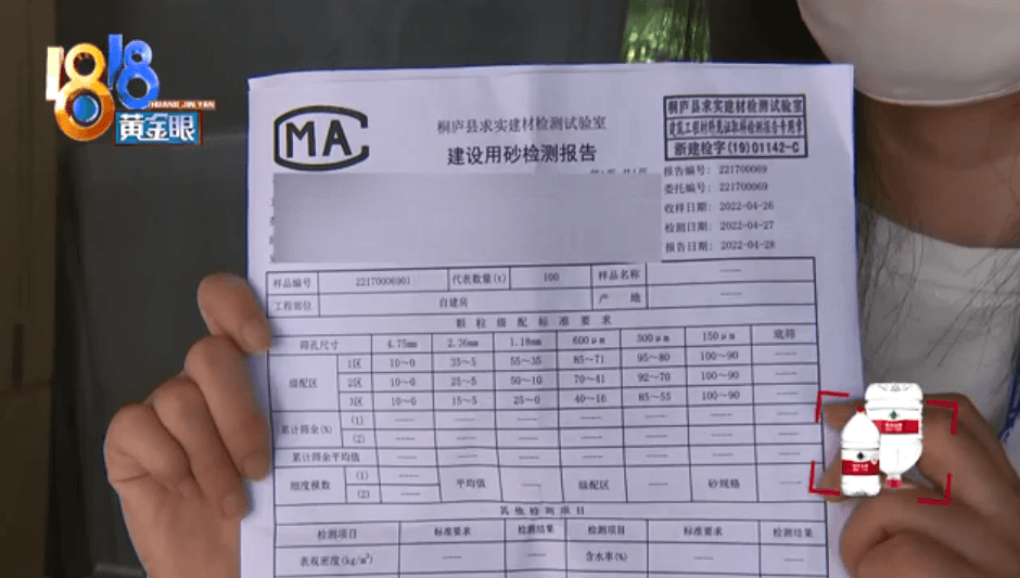 在建設(shè)用砂檢測報(bào)告中結(jié)論是“試樣經(jīng)檢測,其含泥量為3.6,氯離子含量0%”。雖未明確是否合格,檢測機(jī)構(gòu)工作人員表示,“她只讓做了這兩個(gè)數(shù)據(jù),這兩個(gè)數(shù)據(jù)是符合要求的。”