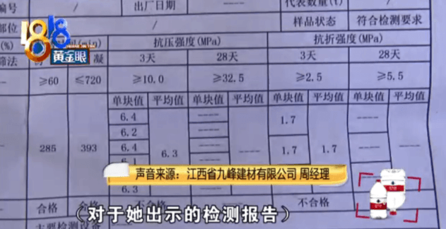 針對(duì)記者提出的關(guān)于檢測結(jié)果的問題,周經(jīng)理表示:這批次水泥已經(jīng)檢查過了,是合格的。對(duì)于唐女士出示的檢測報(bào)告,他表示不認(rèn)可。