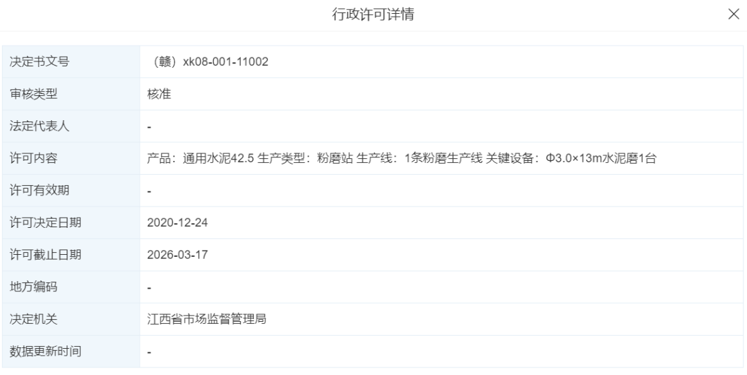 經(jīng)查詢企業(yè)生產(chǎn)許可證編號(hào)(贛)XK08-001-11002,企業(yè)類型為粉磨站,擁有一條粉磨生產(chǎn)線,關(guān)鍵設(shè)備為Φ3.0×13m水泥磨1臺(tái)。
