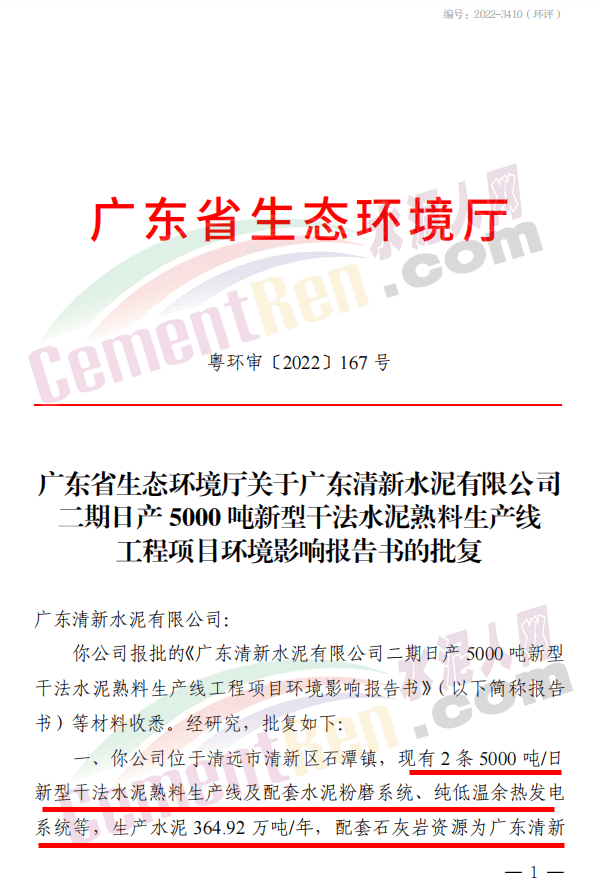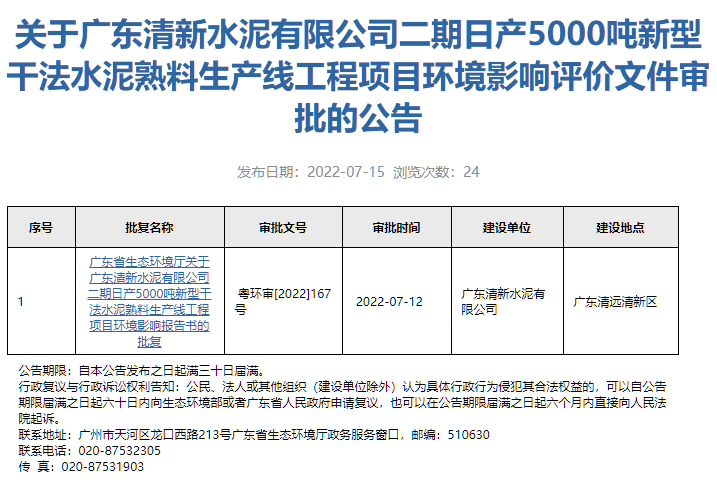 日前,廣東生態(tài)環(huán)境廳發(fā)布《關(guān)于廣東清新水泥有限公司二期日產(chǎn)5000噸新型干法水泥熟料生產(chǎn)線工程項(xiàng)目環(huán)境影響評價(jià)文件審批的公告》提到廣東清新水泥有限公司報(bào)批的《廣東清新水泥有限公司二期日產(chǎn) 5000 噸新型干法水泥熟料生產(chǎn)線工程項(xiàng)目環(huán)境影響報(bào)告書》(以下簡稱報(bào)告書)等材料收悉。