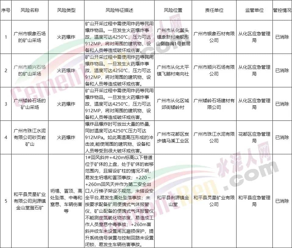 水泥人網(wǎng)注意到名單中包括廣東市珠江水泥有限公司砂頁巖礦山、廣州市越堡水泥有限公司礦山采場和廣州市珠江水泥有限公司礦山采場等多家礦山。涉及風(fēng)險(xiǎn)類型為火藥爆炸、坍塌、冒頂、高處墜落、中毒和窒息、車輛傷害、機(jī)械傷害、潰壩、車輛傷害、起重傷害、觸電、淹溺、火災(zāi)、透水等。