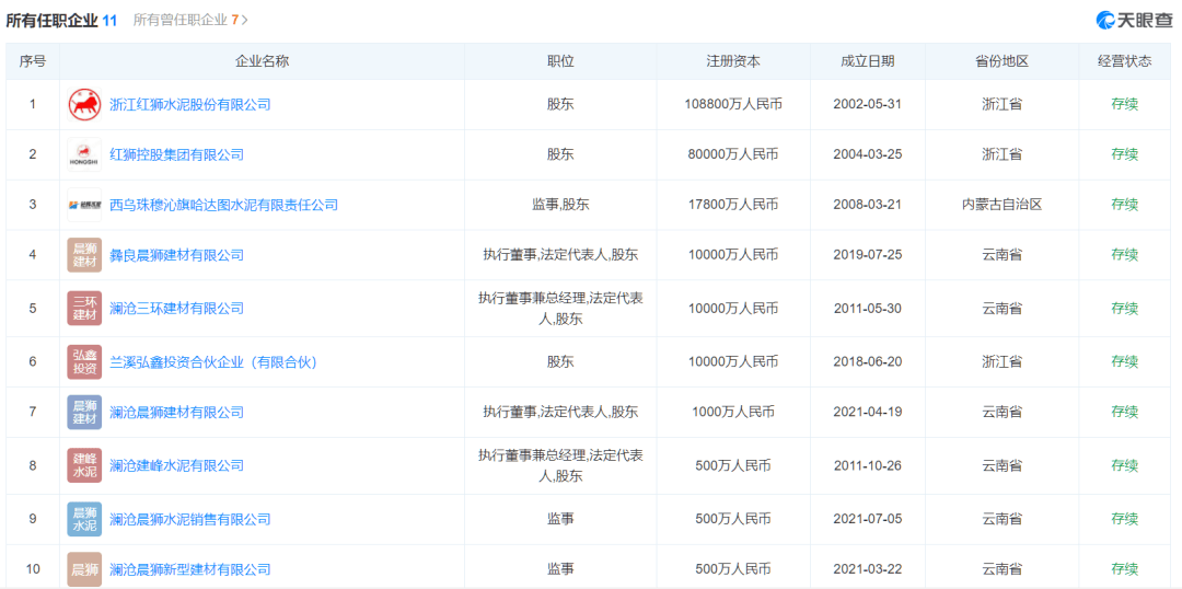 天眼查顯示,楊志明還曾擔(dān)任浙江紅獅水泥股份有限公司、紅獅控股集團(tuán)有限公司、西烏珠穆沁旗哈達(dá)圖水泥有限責(zé)任公司等多家企業(yè)股東。
