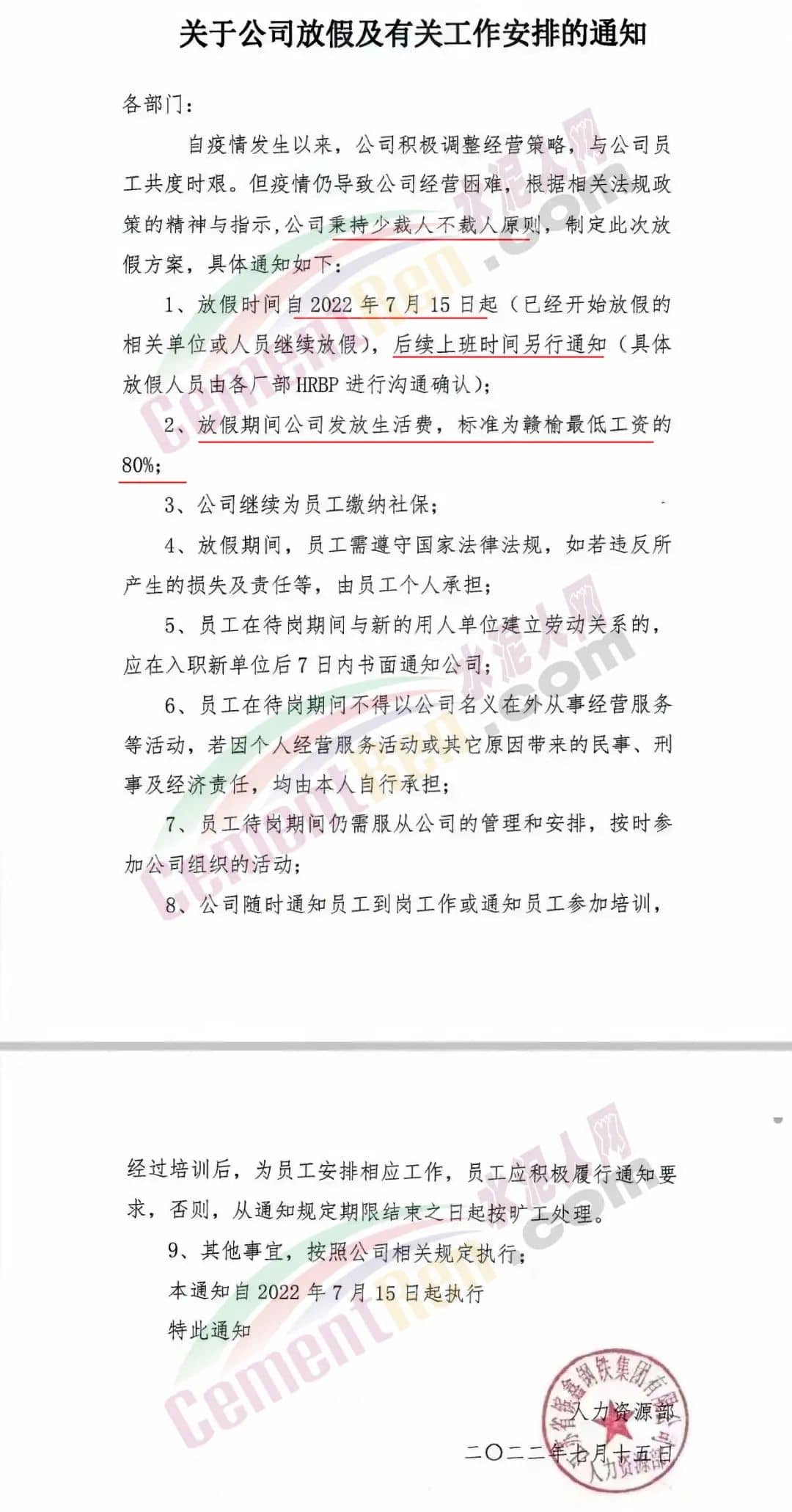 日前,江蘇一家鋼鐵公司發(fā)放假通知稱,自疫情發(fā)生以來(lái),公司積極調(diào)整經(jīng)營(yíng)策略,與公司員工共度時(shí)艱。但疫情仍導(dǎo)致公司經(jīng)營(yíng)困難,根據(jù)相關(guān)法規(guī)政策的精神與指示,公司秉持少裁人不裁人原則,制定放假方案。放假時(shí)間自2022年7月15日起,后續(xù)上班時(shí)間另行通知;放假期間公司發(fā)放生活費(fèi),標(biāo)準(zhǔn)為贛榆最低工資的80%……