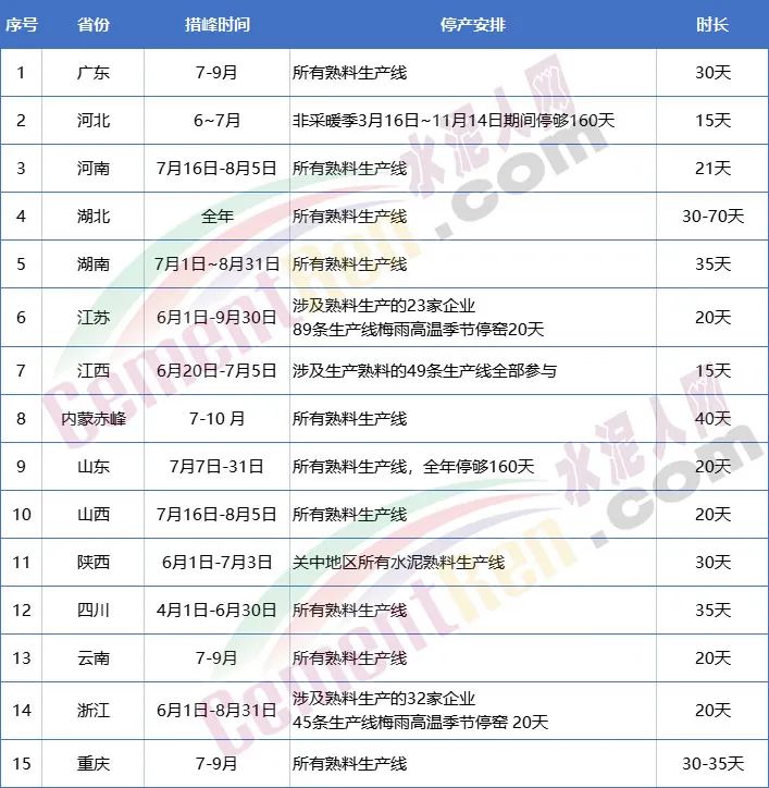 截至目前已經(jīng)有十多個(gè)地區(qū)域發(fā)布了夏季錯(cuò)峰生產(chǎn)通知,要求區(qū)域內(nèi)熟料企業(yè)于近期開(kāi)啟錯(cuò)峰生產(chǎn)。