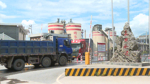 在廠區(qū)門口,多輛水泥運輸車來回穿梭,工人們搬運作業(yè)有序,現(xiàn)場一派緊張忙碌的景象。