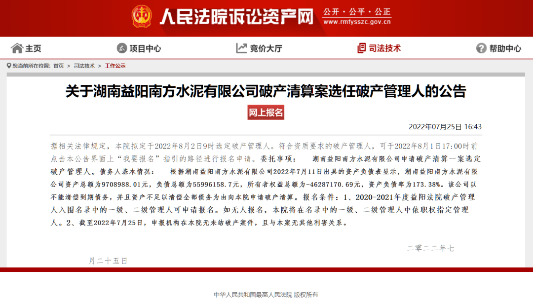 日前,人民法院訴訟資產(chǎn)網(wǎng)發(fā)布《關(guān)于湖南益陽(yáng)南方水泥有限公司破產(chǎn)清算案選任破產(chǎn)管理人的公告》稱(chēng),據(jù)相關(guān)法律規(guī)定,法院擬定于2022年8月2日9時(shí)選定破產(chǎn)管理人。符合資質(zhì)要求的破產(chǎn)管理人,可于2022年8月1日17:00時(shí)前點(diǎn)擊本公告界面上“我要報(bào)名”指引的路徑進(jìn)行報(bào)名申請(qǐng)。