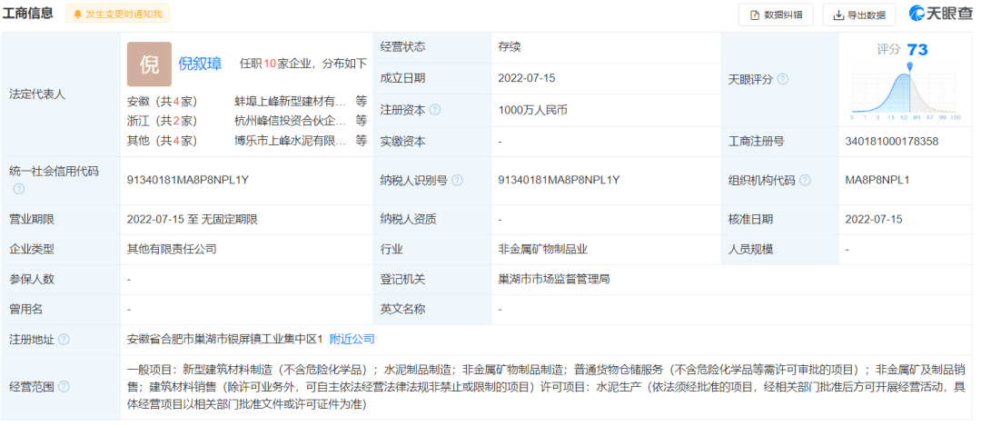 天眼查信息顯示,7月15日,巢湖上峰恒信新型材料有限公司成立,法人倪敘璋。企業(yè)注冊(cè)資本1000萬(wàn)元人民幣,經(jīng)營(yíng)范圍包含:一般項(xiàng)目:新型建筑材料制造(不含危險(xiǎn)化學(xué)品);水泥制品制造;非金屬礦物制品制造;普通貨物倉(cāng)儲(chǔ)服務(wù)(不含危險(xiǎn)化學(xué)品等需許可審批的項(xiàng)目);非金屬礦及制品銷售;建筑材料銷售(除許可業(yè)務(wù)外,可自主依法經(jīng)營(yíng)法律法規(guī)非禁止或限制的項(xiàng)目)許可項(xiàng)目:水泥生產(chǎn)(依法須經(jīng)批準(zhǔn)的項(xiàng)目,經(jīng)相關(guān)部門批準(zhǔn)后方可開(kāi)展經(jīng)營(yíng)活動(dòng),具體經(jīng)營(yíng)項(xiàng)目以相關(guān)部門批準(zhǔn)文件或許可證件為準(zhǔn))