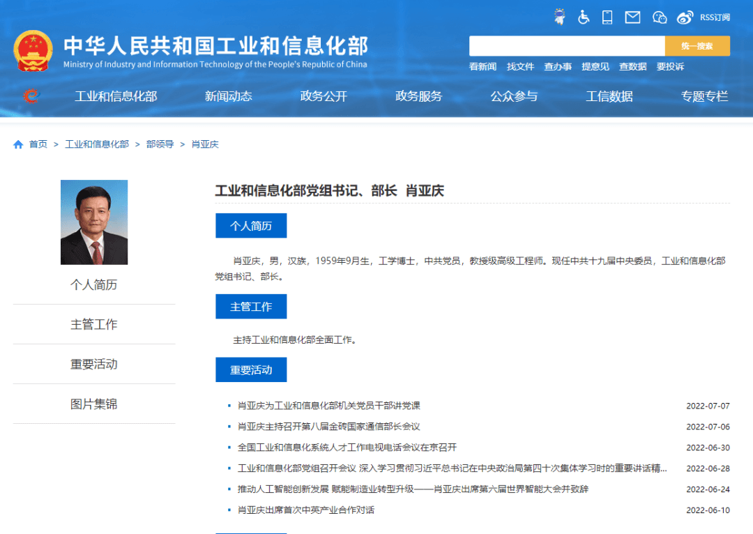 2020年7月31日,中共中央決定:肖亞慶同志任工業(yè)和信息化部黨組書記,苗圩同志不再擔任工業(yè)和信息化部黨組書記。