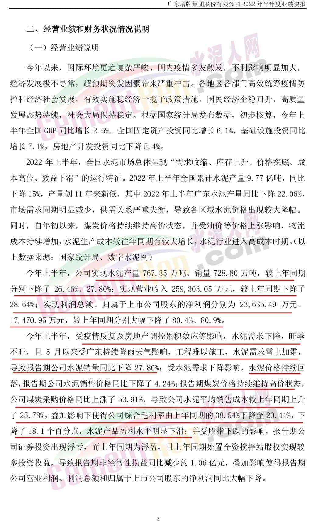 今年上半年,受疫情反復(fù)及房地產(chǎn)調(diào)控累積效應(yīng)等影響,水泥需求下降,旺季不旺,且5月以來(lái)受廣東持續(xù)降雨天氣影響,工程難以施工,水泥需求雪上加霜,導(dǎo)致報(bào)告期公司水泥銷(xiāo)量同比下降27.80%;受水泥需求下降影響,水泥價(jià)格持續(xù)回落,報(bào)告期公司水泥銷(xiāo)售價(jià)格同比下降了4.24%;報(bào)告期煤炭?jī)r(jià)格持續(xù)維持高價(jià)狀態(tài),導(dǎo)致公司水泥平均銷(xiāo)售成本較上年同期上升了25.78%。