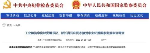 7月28日16時30分,據(jù)中央紀(jì)委國家監(jiān)委官網(wǎng)消息,工業(yè)和信息化部黨組書記、部長肖亞慶同志涉嫌違紀(jì)違法,目前正在接受中央紀(jì)委國家監(jiān)委審查調(diào)查。