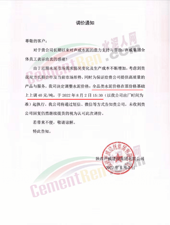 同日,銅川聲威建材有限責(zé)任公司通知自8月2日起上調(diào)全品類水泥價(jià)格40元/噸。