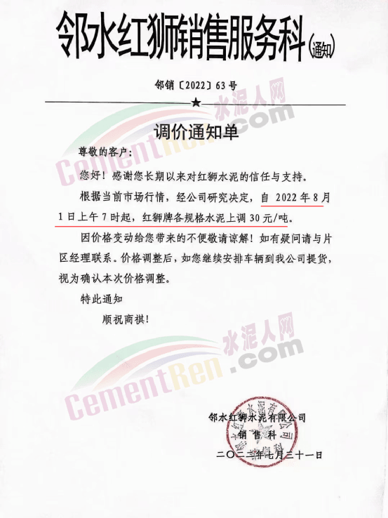 四川廣安鄰水紅獅水泥有限公司銷售科通知,根據(jù)當(dāng)前市場行情,經(jīng)公司研究決定,自8月1日上午7時(shí)起,紅獅牌各規(guī)格水泥上調(diào)30元/噸。