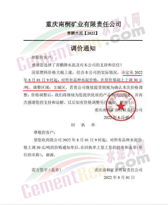 重慶南桐礦業(yè)有限責(zé)任公司通知,因原燃料價(jià)格大幅上漲,結(jié)合公司實(shí)際情況,決定從8月1日9時(shí)起,對發(fā)往重慶主城區(qū)所有品種水泥價(jià)格,在原價(jià)基礎(chǔ)上上調(diào)30元/噸。