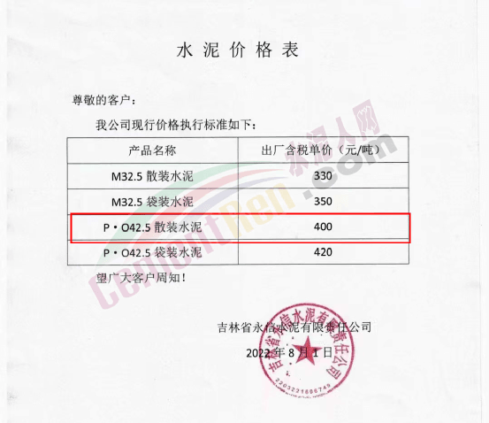 吉林省伊通凱麒水泥有限公司通知,受原材料價(jià)格上漲等因素影響,經(jīng)研究決定,公司于8月2日上午8時(shí)起對水泥銷售價(jià)格做出調(diào)整,調(diào)整后42.5散裝水泥出廠含稅報(bào)價(jià)370元/噸。