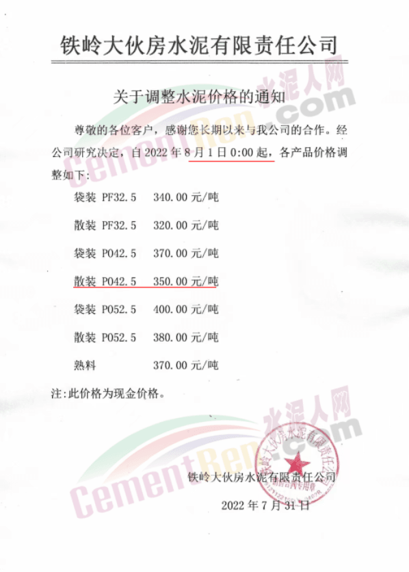 遼寧鐵嶺大伙房水泥有限責(zé)任公司通知,自8月1日0時(shí)起,調(diào)整水泥價(jià)格,調(diào)整后P.O42.5散裝水泥報(bào)價(jià)350元/噸。