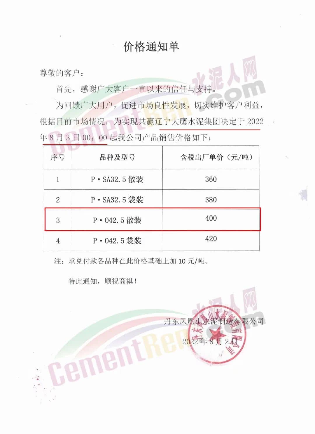 丹東鳳凰山水泥有限公司通知根據(jù)目前市場情況,遼寧大鷹水泥集團(tuán)決定于8月3日0時(shí)起調(diào)整產(chǎn)品銷售價(jià)格,調(diào)整后P.O42.5散裝水泥報(bào)價(jià)400元/噸。